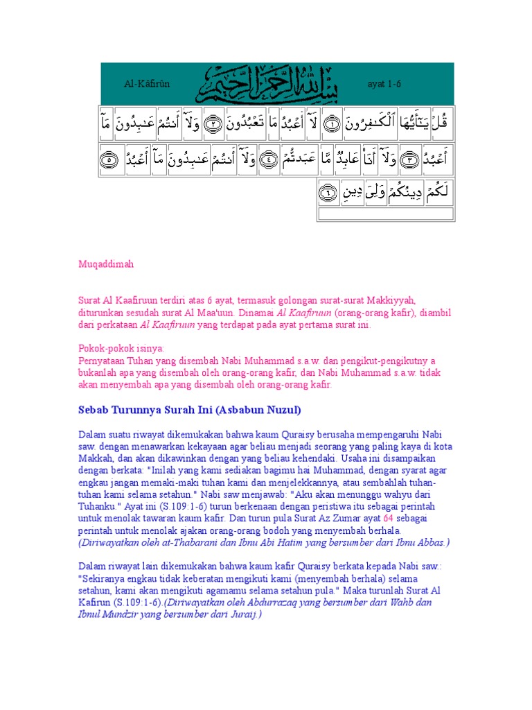 (diriwayatkan oleh abdurrazaq yang bersumber dari wahb dan ibnul mundzir yang bersumber dari juraij.) surah al kafirun ini memiliki ayat yang sedikit dan pendek, jadi sangat mudah untuk dihafalkan. Surah ini terdiri dari 3 ayat dan termasuk kedalam golongan surah makkiyah. Bahwa surat ini tidak menafikan perintah untuk berjihad, sehingga dikatakan. Surat ini tergolong sebagai surat makkiyah karena diturunkan saat rasulullah masih di mekkah dan diturunkan setelah surat al maun. Bagi kalian agama kalian yang kalian bersikukuh karena itulah allah membedakan di antara kedua golongan tersebut seraya berfirman, untukmulah agamamu tetapi yang lebih tepat: