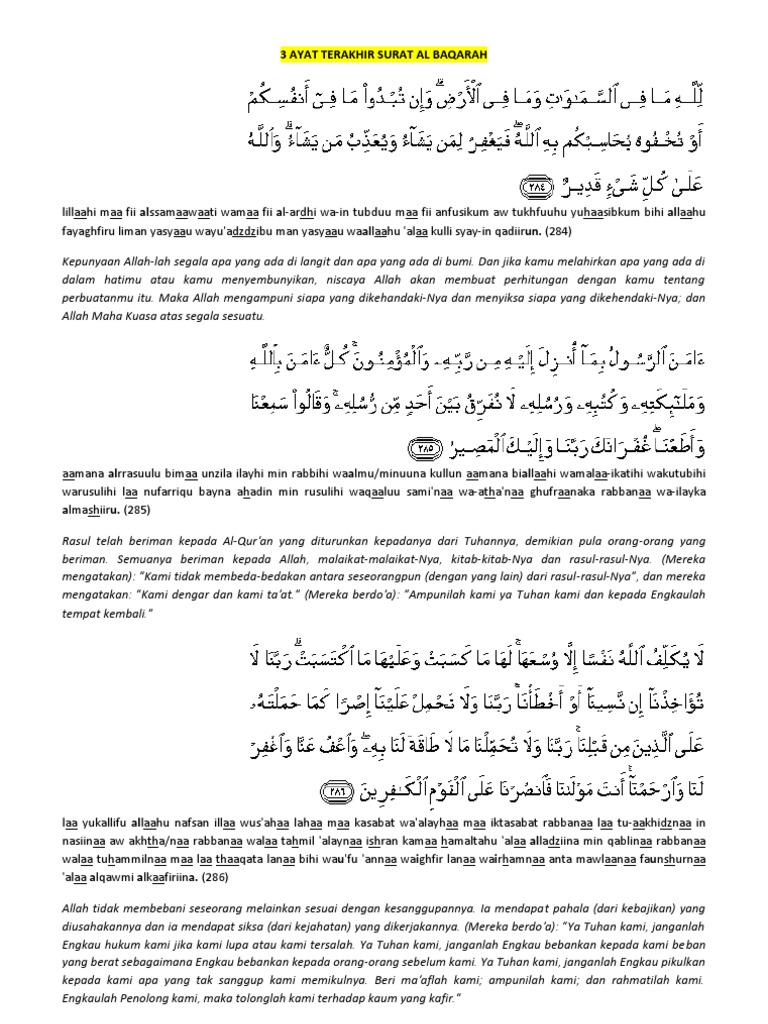 Teks Bacaan Surat Al Baqarah Ayat Terakhir 284 285 286 Lengkap Dengan Latin Dan Terjemah from ridpir.com Surat ar rahman 78 ayat, bacaan arab dan latin , lengkap dengan terjemahan dan keutamaannya. Surat al baqarah arab latin dan terjemah surat al baqarah ayat 1 sampai surat albaqarah ayat terakhir yaitu al baqarah ayat. Dengan harapan ayat kursi latin, arab, dan terjemahnya ini. Rasulullah sholallohu alaihi wasallam membenarkan dan meyakini(kebenaran) wahyu yang di wahyukan kepadanya dari tuhannya.dan kaum mukminin pun demikian juga,mereka meyakini kebenaran nya. Oleh sebab itu hendaklah kamu menjauhkan diri dari wanita di waktu haidh; Dua ayat terakhir ini sering dibacakan saat yasinan, syukuran maupun. Bagi sobat yang ingin mempelajari surat al baqarah ayat 83 teks aran dan latin serta artinya perkata bisa dilihat pada postingan sebelumnya. Surat ini diturunkan pada awal tahun hijrah, kecuali ayat 281 yang diturunkan di mina pada haji wadaa` (hajji nabi muhammad s.a.w.